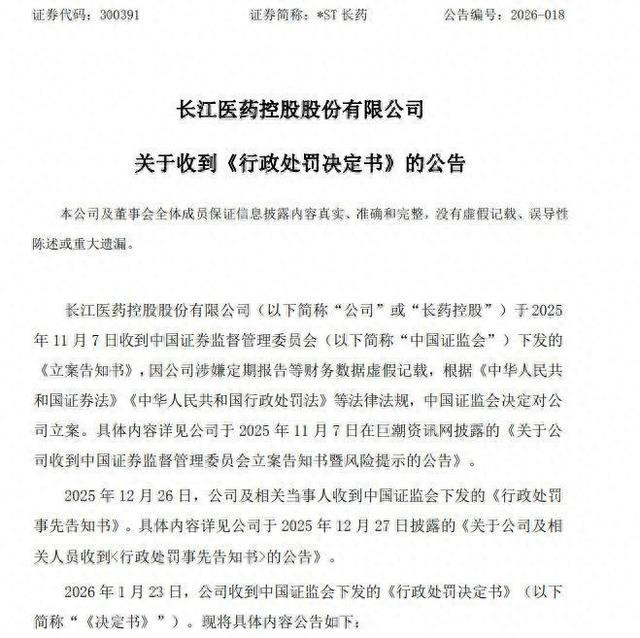 扬子晚报网1月24日讯(记者范晓林薄云峰)1月23日,证监会对*ST长药下发《行政处罚决定书》,认定其在2021年至2023年间连续三年通过虚增收入与利润进行财务造假,触及重大违法强制退市情形,深交所同步对公司下发终止上市《事先告知书》,启动退市程序。公司股票自26日开市起停牌。