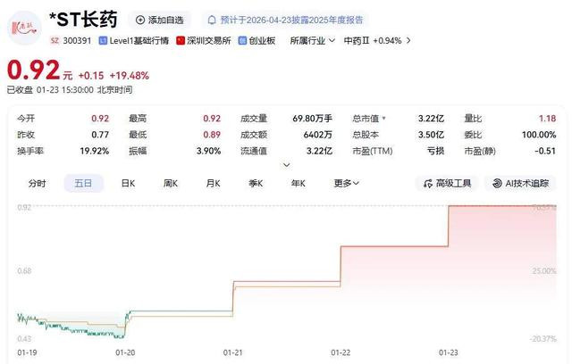 截至1月23日,*ST长药连续4个交易日涨停,累计涨幅达109.09%,最新股价报0.92元/股,总市值为3.22亿元。